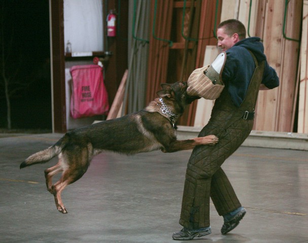 These dogs are first run through what’s called the “courage test” to make sure that they are indeed balanced and have the disposition to become a police patrol dog. Not all dogs pass this test. The ones that don’t pass still go to good homes as a family or security dog. The next step is that these dogs are run through general obedience and agility training. Once these dogs are trained and matched with a human partner, the real training and bite work begins. All these dogs are rewarded their favorite toy after each bite during training. It’s all about fun for them.