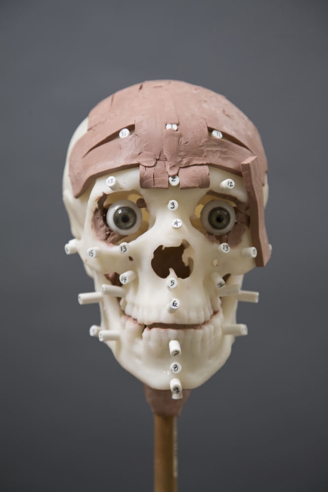 There are carefully applied steps to begin the reconstruction process of the face.  Markers are placed on various areas of the skull to indicate the depths of tissue to be added (see photo above).  Studies over the years have indicated the measurements of the depth of facial features based upon different ancestral groups.