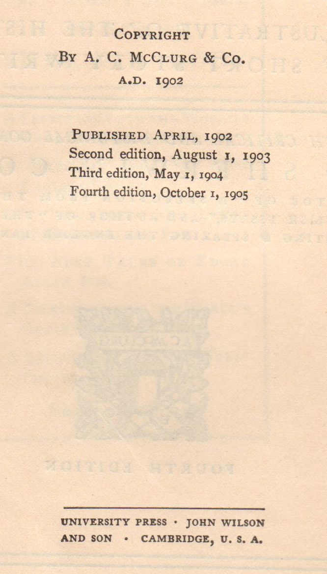 Sherwin Cody (1868-1959) was an entrepreneur and writer of many books on writing, and best known for his home study writing courses advocating colloquial style and grammar. At the time that this particular book was published, it was used by Cornell College, Harvard University, and Vassar College to name a few.