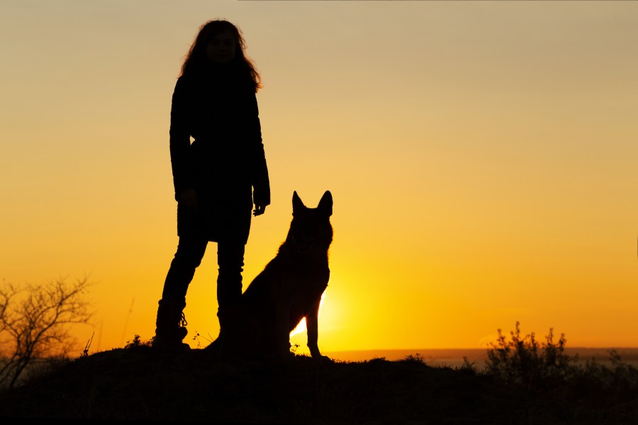 silhouette of young woman walking with a dog in the field at sunset, pet sitting near girl’s leg on nature, figure of friends in heroic pose, human and animal